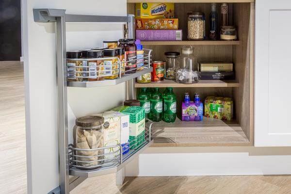 The cupboard everybody loves to hate. In U-shaped or L-shaped kitchen designs (some of the most common) they can be impossible to avoid and so considering how to maximise your corner cupboard storage is very important. There are three designs to choose from, the Magic Corner unit, the Le Mans design and the Carousel. The Magic Corner and Le Mans systems work in very similar ways; a complex hinged design neatly tucks the shelves into the full depth of the corner and allows them to be pulled right out into the room so you have access to the whole of the cupboard. Both Le Mans and Magic Corner are effective in improving accessibility, yet both detract slightly from the capacity of the space. Magic Corner will offer slightly greater capacity than Le Mans but can be more expensive. Le Mans features an anti-slip coating and low barriers ideal for storing pots, pans and larger items and so you will need to consider which suits your individual needs best. Carousels again work similarly but won’t extend into your space like the other two designs. They can be a more affordable option with similar practical capabilities.