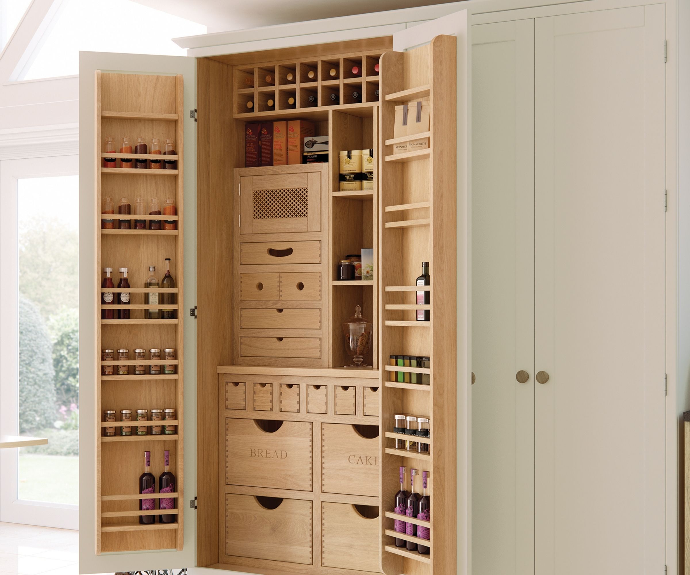 Dresser and pantry units are a signature Aisling kitchen feature, providing the ideal storage solution for those who favour a well-organised kitchen. Dresser units make a versatile addition to the kitchen. They can be used to house a range of luxurious features from drinks bars to breakfast stations. Your dresser can include a custom arrangement of glass holders, chopping boards, bottle rack and concaves and drawers. Pantry cupboards also make a popular choice, offering an abundance of practical storage options such as wine and bottle racks, open shelving and other drawers which can be meticulously finished with carved bespoke labels.