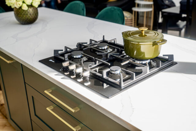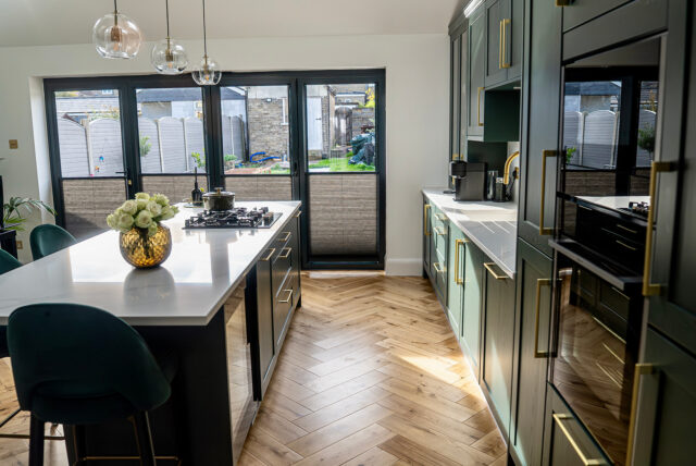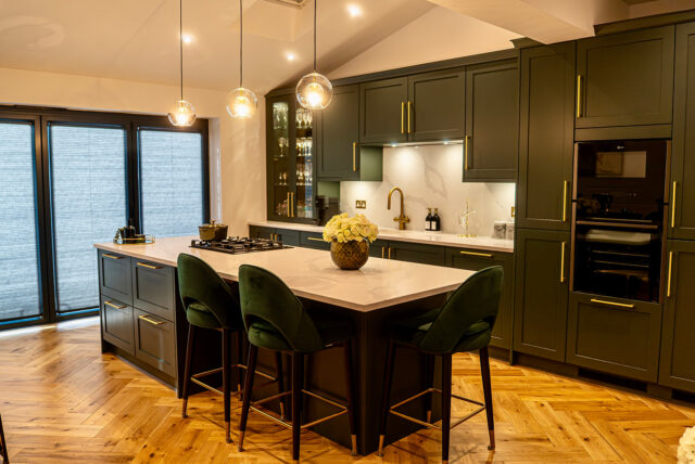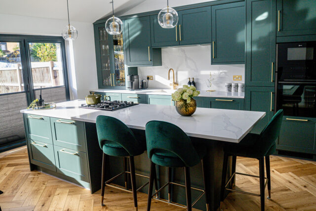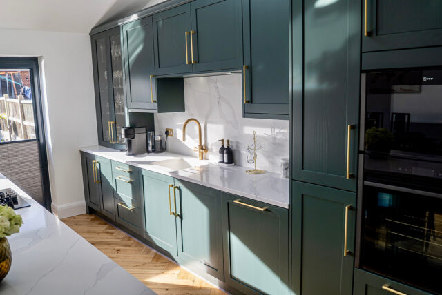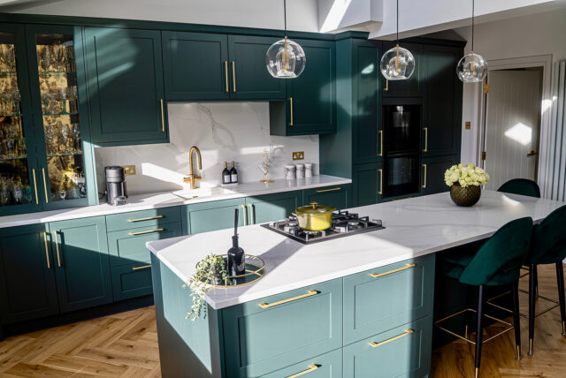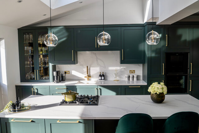 This Aldana Heritage Green shaker kitchen strikes a beautiful balance between timeless style and modern refinement. The rich green cabinetry forms the perfect backdrop for Calacatta Gold Quartz worktops and full-height splashbacks, which add a subtle marble texture and soft veining throughout the space.
