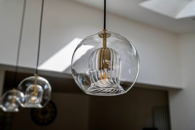 Every element was chosen for both form and function. The Slide & Hide Neff oven, integrated fridge, dishwasher, and wine cooler ensure seamless usability without interrupting the clean lines of the cabinetry. Overhead, warm white glass pendants provide a soft, ambient glow, beautifully highlighting the solid oak herringbone flooring beneath.