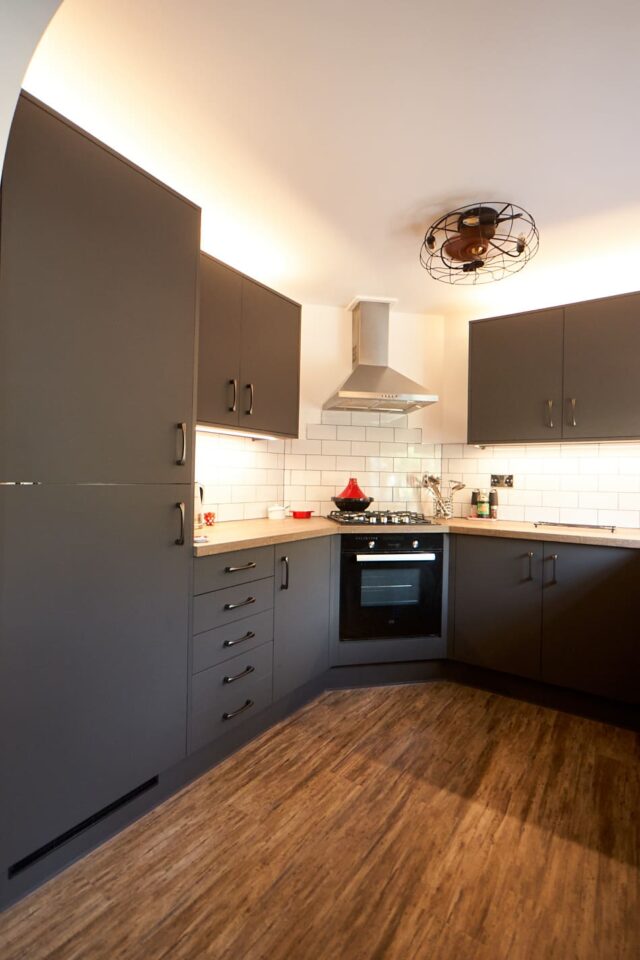 This kitchen, from our Avola Perfect Sense range, presents an ideal blend of style and functionality with sleek, matte grey cabinetry featuring clean lines and minimalistic handles. The choice of materials in this design is both practical and beautiful, with subtle worktops providing ample workspace, and the warm, natural tones of the wood flooring add a cosy contrast to the graphite grey, grounding the space and bringing a touch of warmth.