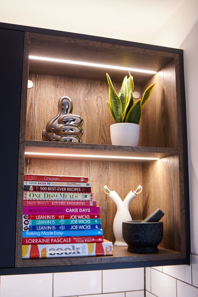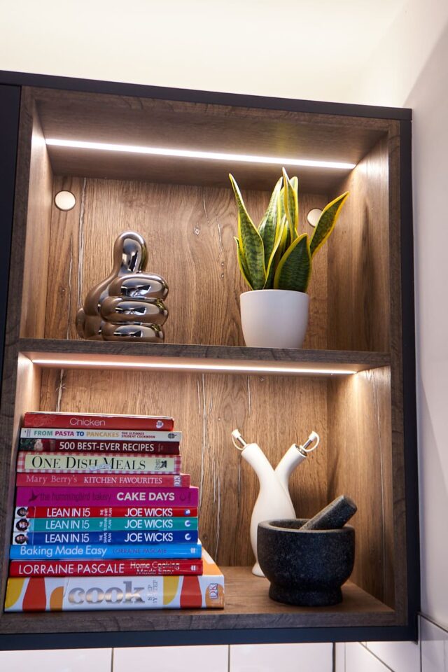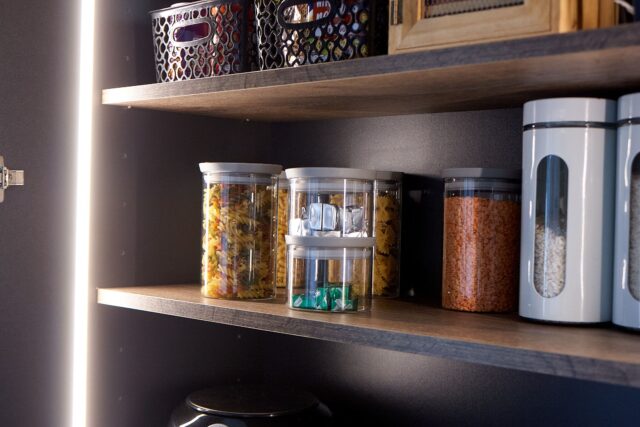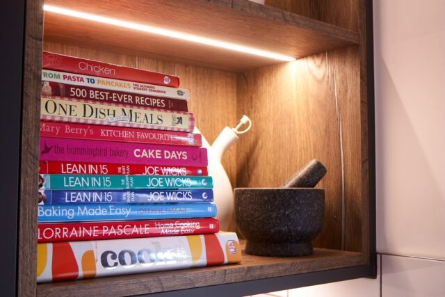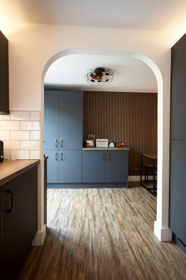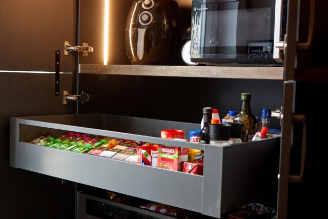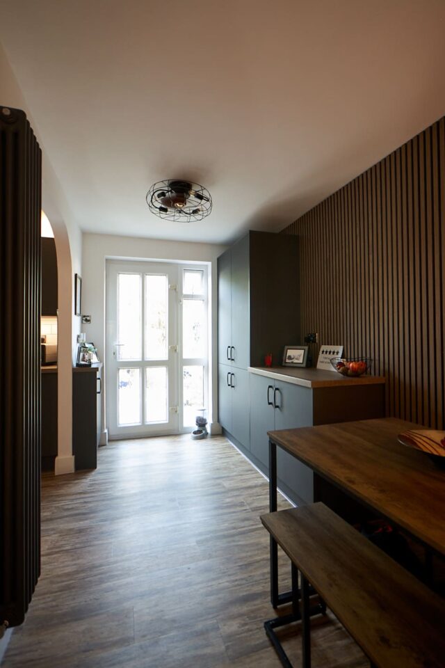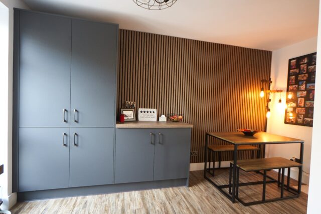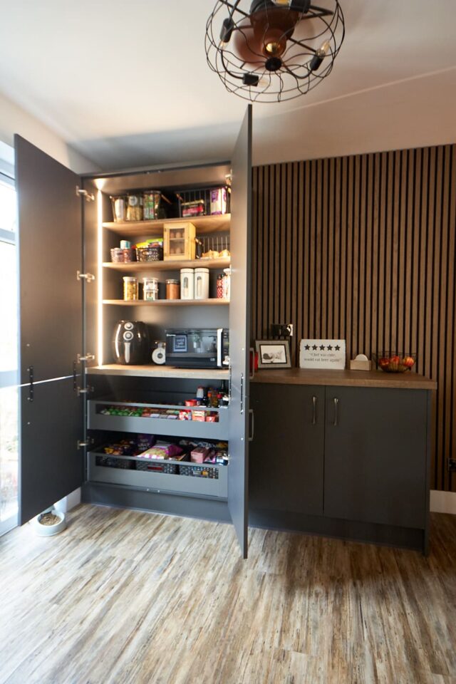 Offering a refined look that seamlessly integrates into the kitchen, the larder is elegant and functional, with sleek, matte grey cabinets, soft close doors and ample storage space for all Emma’s essentials. The hand-crafted quality of the cabinetry is evident in every detail, from the smooth, flawless finish to the sturdy, easy-to-grip handles that add a touch of sophistication. The design is elevated further by the striking wooden vertical panelling on the wall, which introduces texture, creating a warm yet contemporary feel.