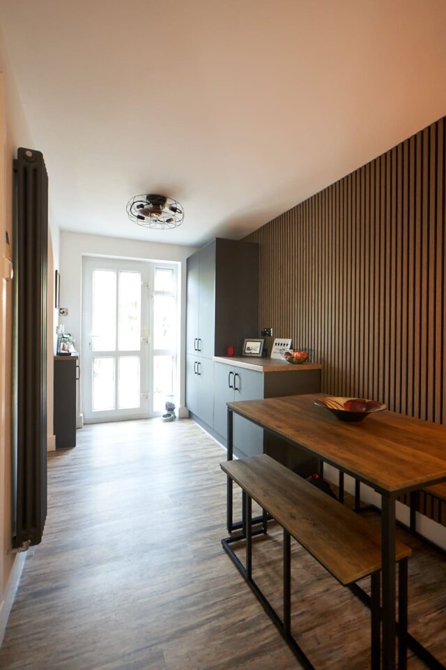 Our client, Emma, was looking for a room that was cohesive with her open-plan dining room. She also had a blank wall she wanted to optimise, so we cleverly incorporated a double larder, worktops and cupboards, which is now her favourite part of the new kitchen.