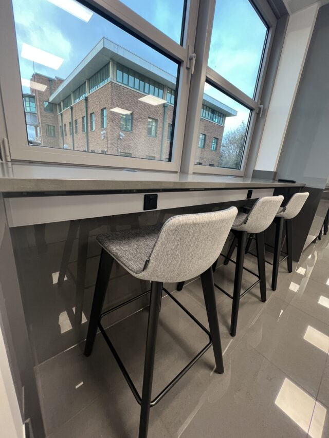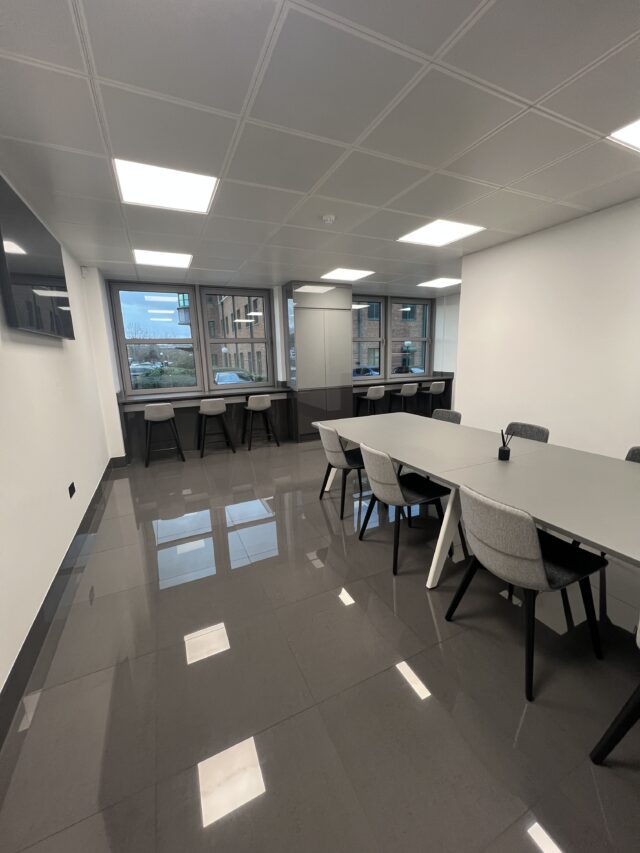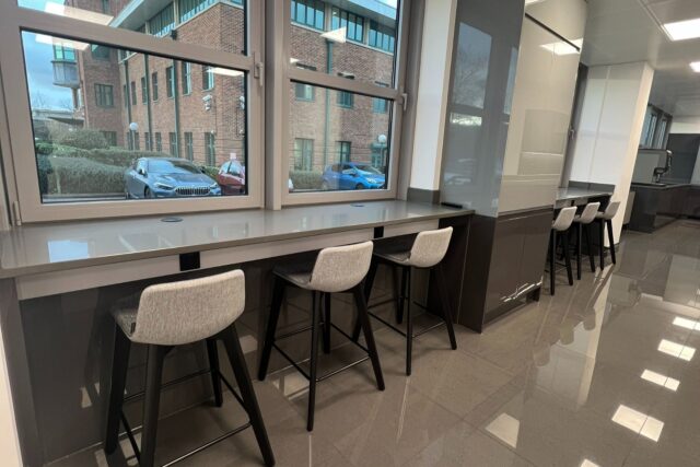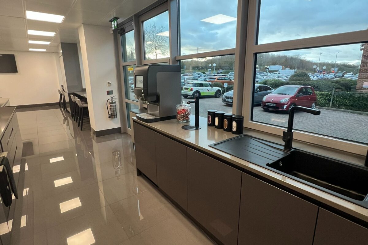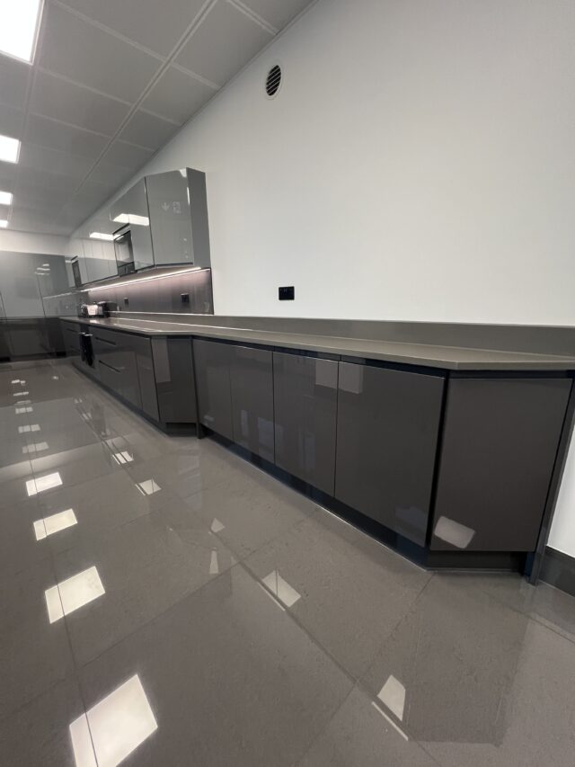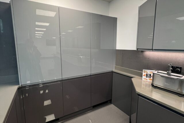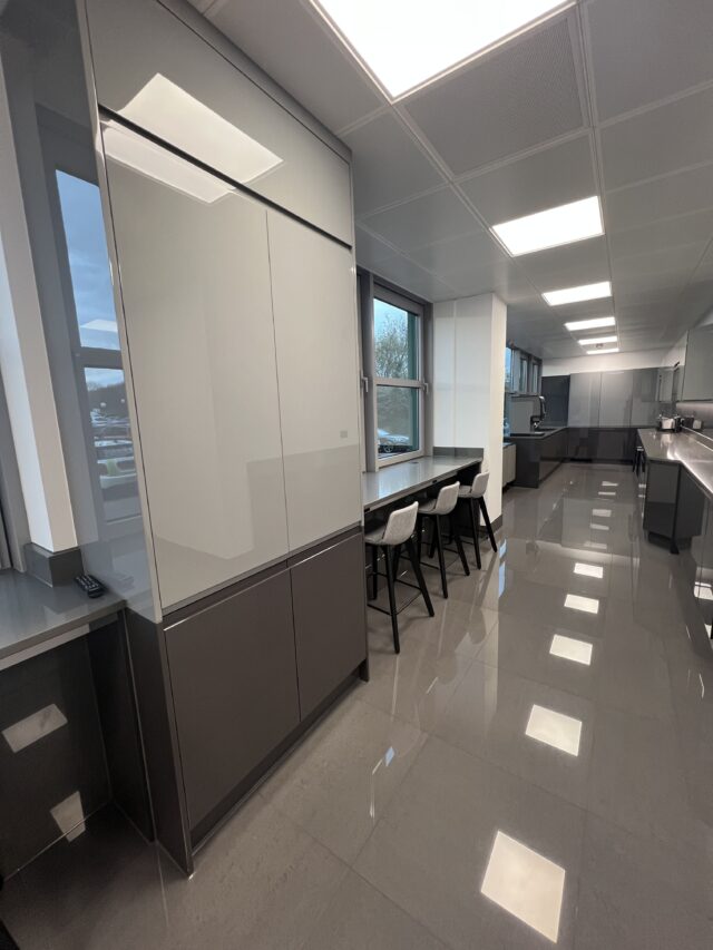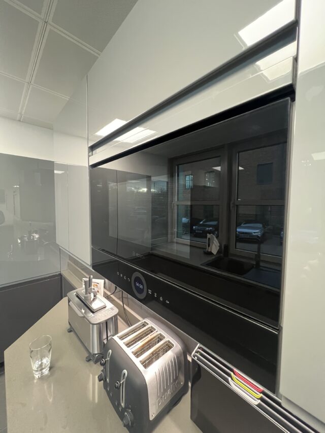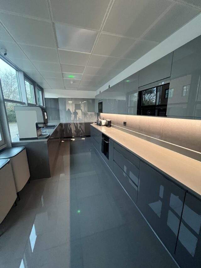We kept the kitchen aligned with the company’s interior colour scheme, working with contrasting tones of dust grey and graphite. These shades beautifully complemented the dark grey floor tiles, creating a sleek and modern aesthetic. Seeing the finished space come together was incredibly rewarding, knowing it will play a part in enhancing the day-to-day experience for the staff.
