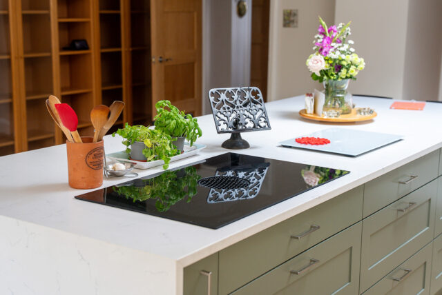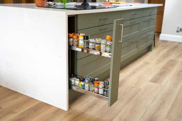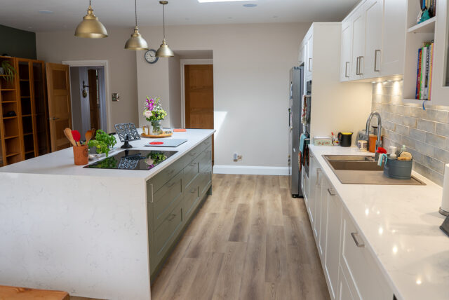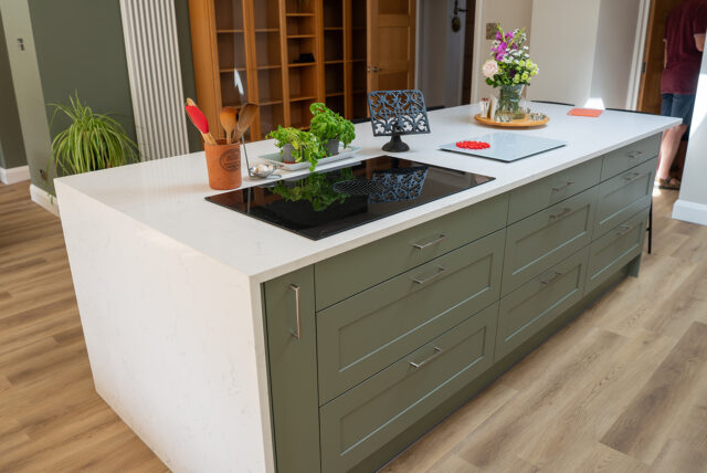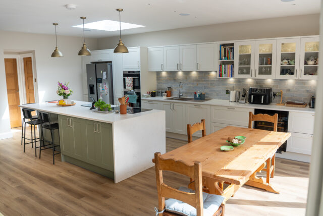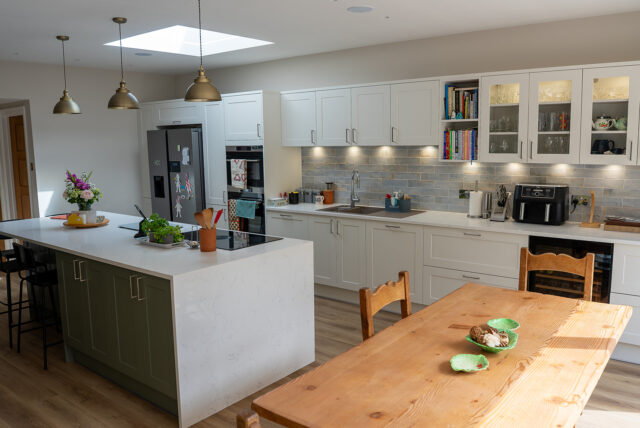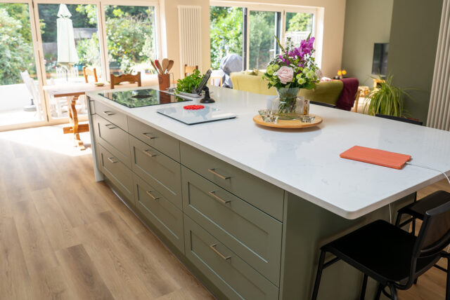 At the heart of the design sits a generous island finished in Regiment Green, chosen for its subtle warmth and natural tone that ties beautifully to the surrounding greenery. The island features seating for four, providing a social hub for family interaction, and houses a combo-hob with integrated extractor for a clutter-free workspace. Overhead, soft brass pendant lighting defines the zone and enhances the inviting atmosphere.
