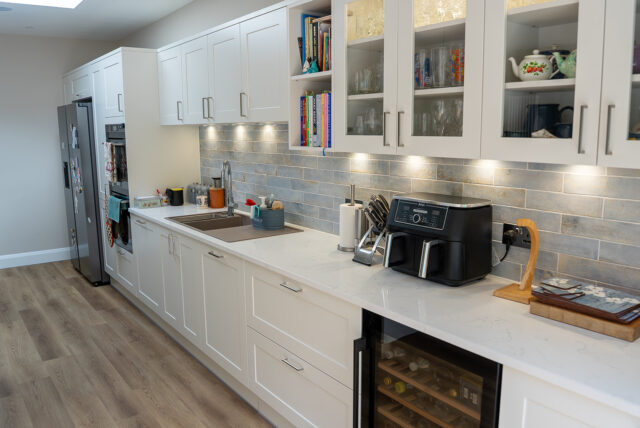 The surrounding cabinetry balances practicality with timeless appeal – a porcelain shaker finish paired with marble-effect quartz worktops for a clean, elegant aesthetic. A mix of glazed and solid-front units offers display and storage flexibility, complemented by a bespoke bookcase niche that adds personality and everyday convenience.