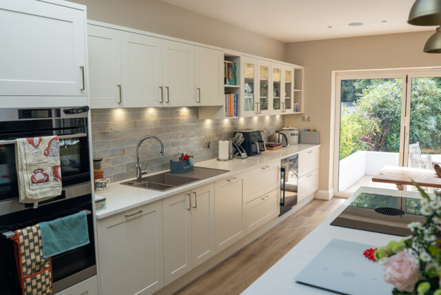 The new kitchen forms the centrepiece of a bright, open-plan extension that unites cooking, dining, and living into one harmonious space. Large sliding doors flood the room with natural light and open directly onto the garden, creating a seamless transition between indoors and out, perfect for summer entertaining.