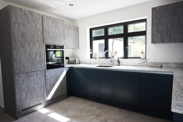 Deep Hartforth blue units tie in beautifully with the rest of the room, creating a luxurious backdrop. Meanwhile, the dramatic Evora Stone units establish a bold contrast, bringing a distinctive contemporary feel to the space. The intuitive Bora hob and single AEG oven offer everything needed for cooking quick meals. Deep pan drawers and a durable Dekton worktop make excellent practical features.