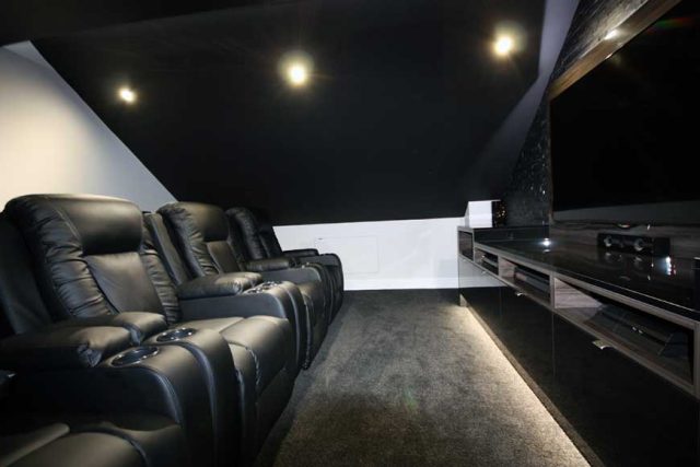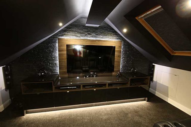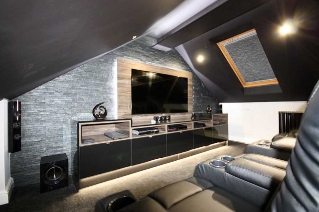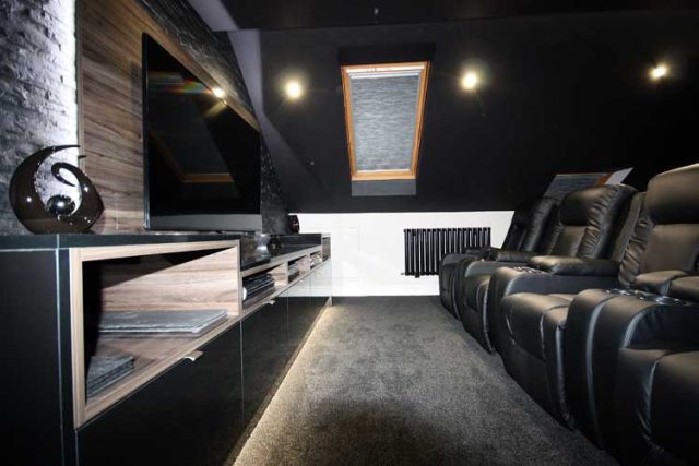 Researching for room ideas for a home cinema room, Mr Brown was looking for something out of the box. Having had his kitchen designed and installed by Ream two years previously, Mr Brown felt reassured that he would get the best out of the loft space he had by visiting and being inspired at Ream’s Gillingham showroom in Kent. Lara, Ream Room Designer was on hand to listen to Mr Brown’s room requirements and add her professional expertise. Lara worked on the home media room design using Mr Brown’s brief which included a bar area with fridge worktops and cabinets for storage. The home cinema area design had an array of storage soft-close cabinets and drawers.