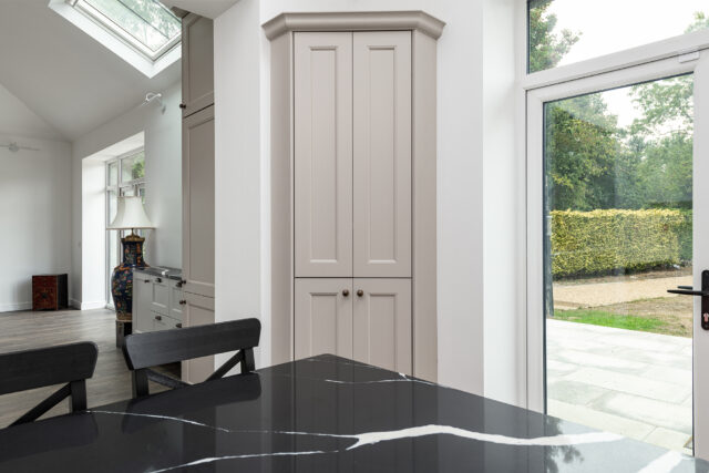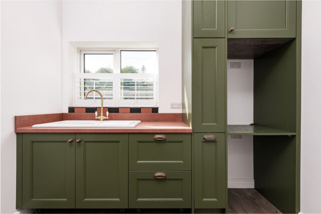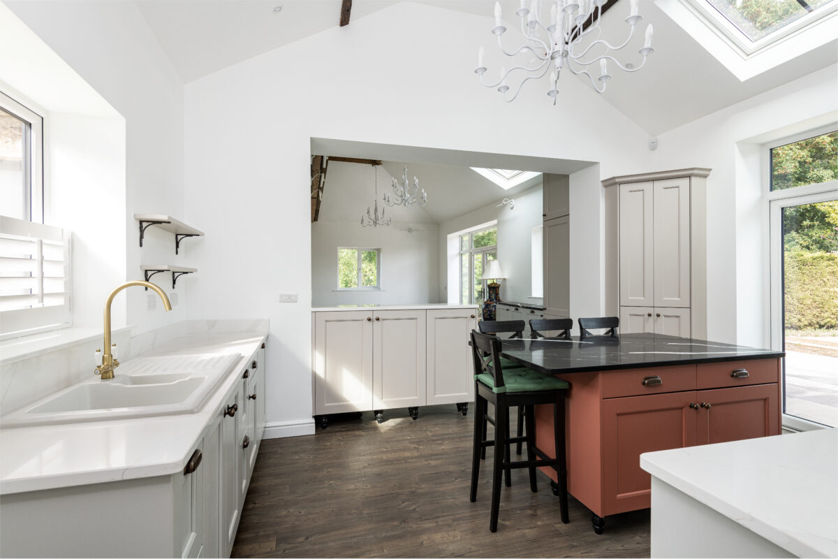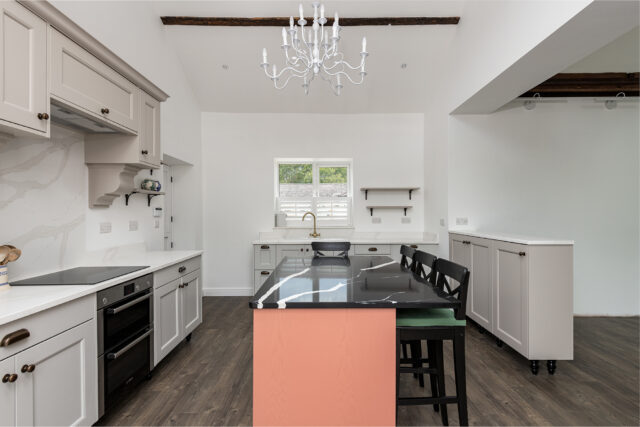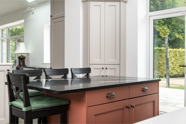 “Mr. and Mrs. Clough had a unique vision for their new kitchen and utility space. With a pristine canvas to work with, they were eager to infuse the area with vibrancy, personality, and an undeniable wow factor that would seamlessly complement their breathtaking new home. By featuring a shaker-style door adorned with a tasteful blend of three distinct colours – Cashmere, Dove Grey, and Pimento – the kitchen exuded a timeless charm infused with a touch of eccentricity. The selection of worktops played a pivotal role, strategically introducing a delightful interplay of patterns and hues throughout the room.”