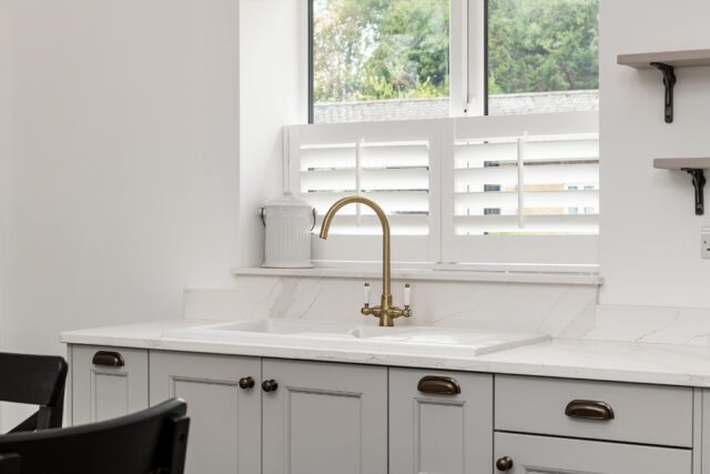 The green breakfast seat cushions mixed with the elegant gold tap add a lovely contrast to the overall theme, creating a space that feels warm and inviting.Details