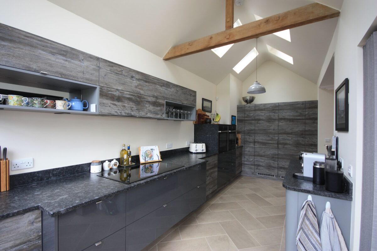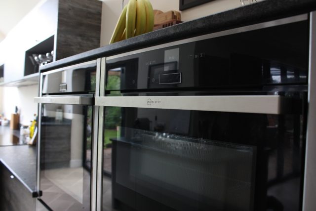 Striking Anthracite Gloss units are balanced beautifully by a soft Zola Matt Grey door and stunning blackened pine accents. The statement look continues with a rare Granite Leather worktop. The stunning pairing of textures and finishes creates a truly showstopping impact, perfect for our client’s spectacular new extension. Two state-of-the-art NEFF ovens and a 4 zone Maxisense hob from AEG offer amazing functionality.