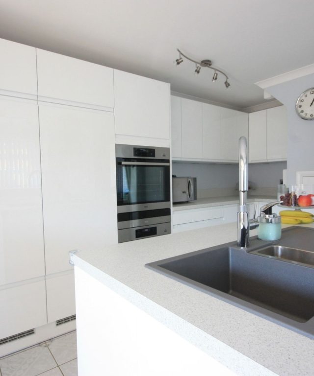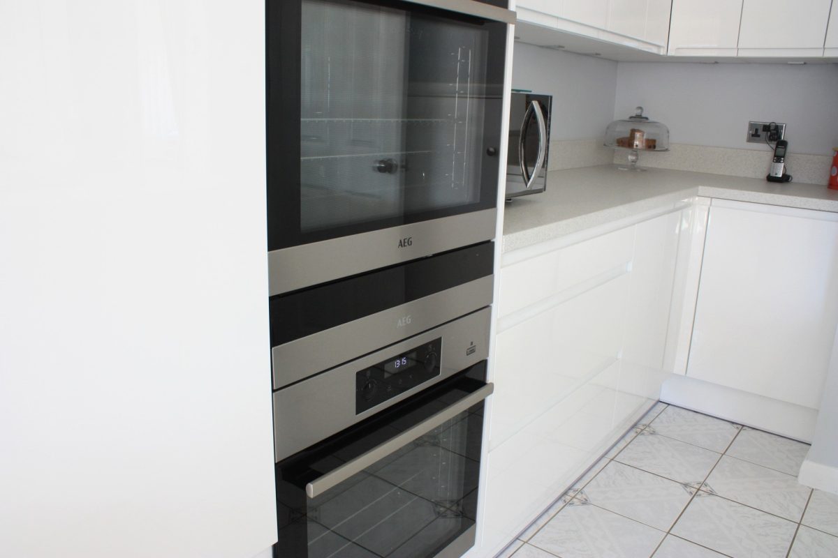 Minimal Strada Gloss cabinets in crisp white have transformed our client’s kitchen into a clean and inviting space to cook. Moving the sink from under the window and repositioning the hob and ovens against opposing walls allowed us to establish a much more practical layout, freeing up plenty of worktop and cupboard space in the primary area of the room.