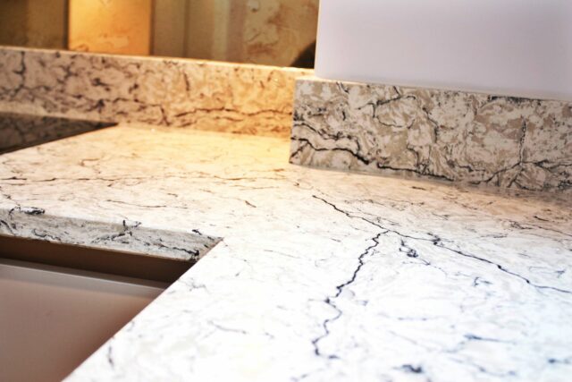 The crowning jewel of this design is the marbled effect worktop. Its mesmerising pattern captured the attention of Mr and Mrs Herridge while browsing our showroom, who could not wait to add this statement décor to their design. This exceptional project is a fusion of textures and hues, accentuated by strategically placed spotlights within the ceiling and beneath the cabinetry, illuminating all the outstanding features.