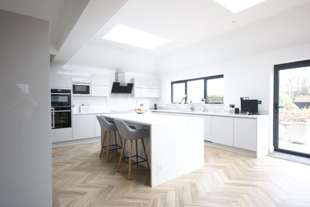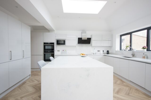 The herringbone pattern on the wooden floor infuses a traditional flair into the contemporary space, balancing the cool whites and greys with its warm tones. Built-in seamless appliances are meticulously integrated into the cabinets, preserving the streamlined and pristine appearance. A state-of-the-art extractor hood rises above the induction cooktop, and the minimalist marble backsplash unites the elements here with sophistication. The kitchen’s design optimises the space and meets the brief creating a soothing yet striking overall look.