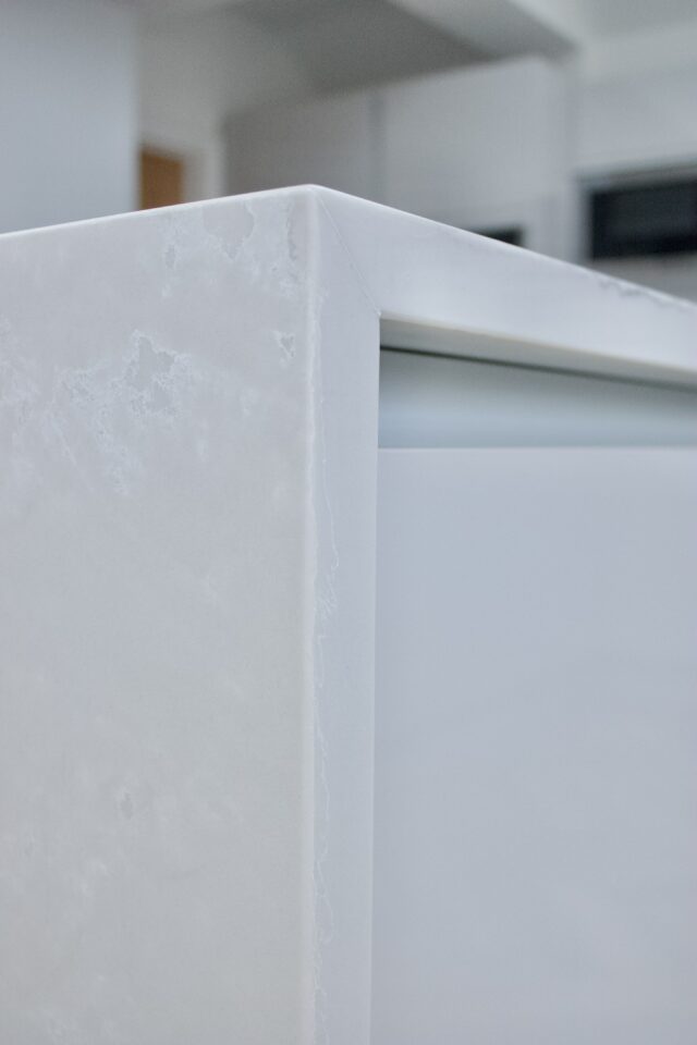 This exceptional kitchen in West Wickham presents a minimalist design with a focus on functionality and sleek aesthetics. The light grey, Zola gloss handleless cabinetry, creates a flawless look, complemented by the elegant marble style worktops, which add a pop of detail to the neutral aesthetic. Central to the space is Mr and Mrs Howe’s favourite feature, a beautiful island complete with a waterfall worktop. This island serves as a culinary preparation zone and a social hub for informal dining.