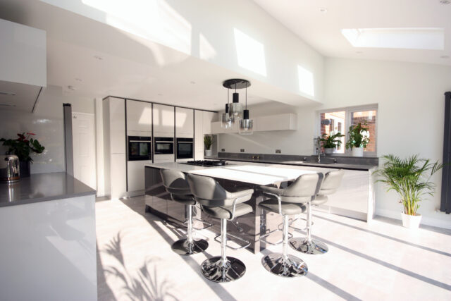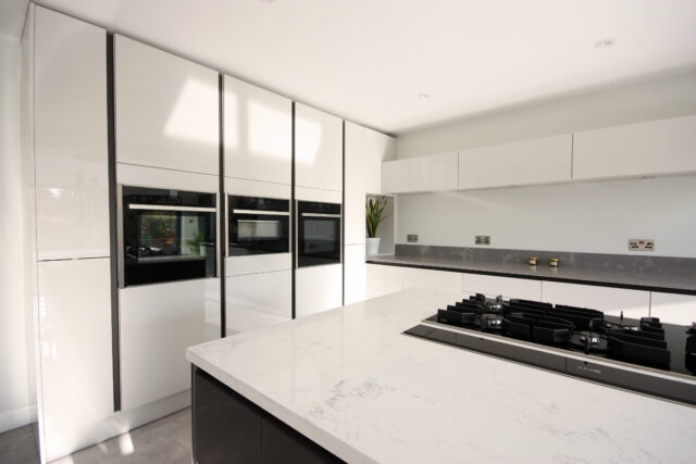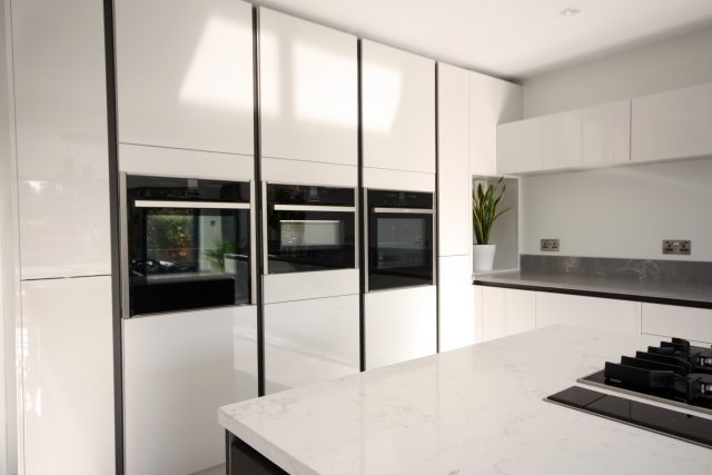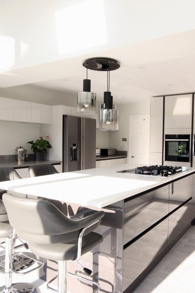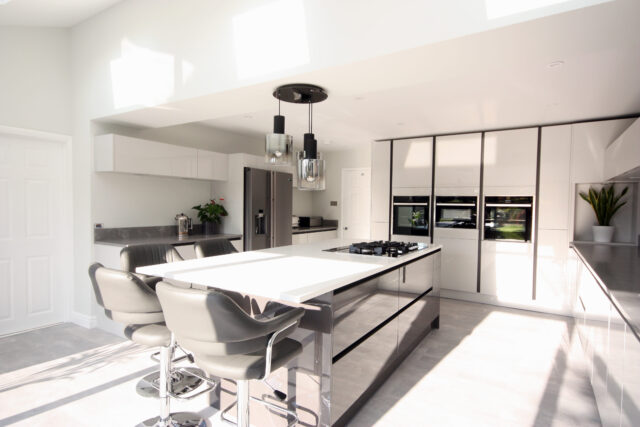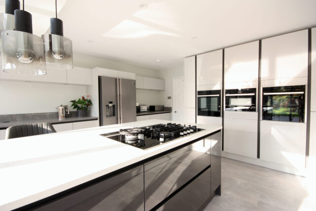 We devised a fantastic layout to make the most of our client’s space, incorporating a host of brilliant appliances as well as a relaxed kitchen island seating area. Handleless Zola gloss units in Light Grey and Graphite create a breath-taking and stylish finish while stunning grey Quartz worktops bring amazing depth to the space.