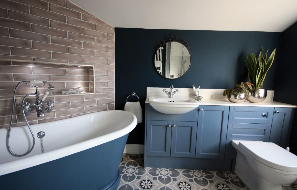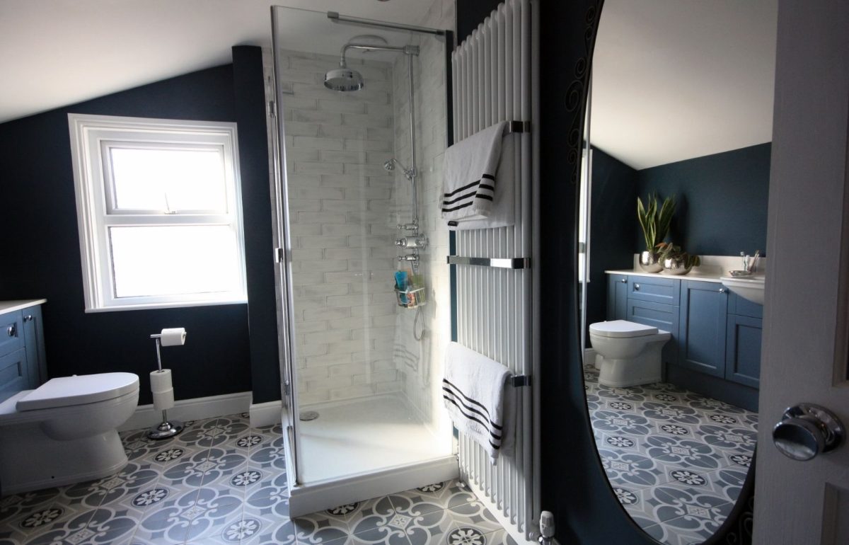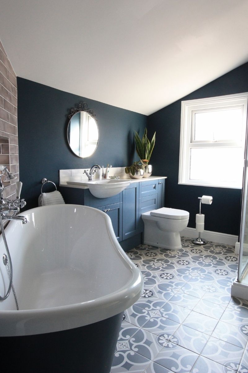A rich blue colour scheme sets a majestic tone to the room. The bold palette creates a wonderful sense of drama while still looking classic and sophisticated. Vintage Belgravia chrome fixtures add a luxurious traditional touch, and a stunning patterned tile floor brings the whole space together. This classically inspired interior will undoubtedly stand the test of time for years to come.