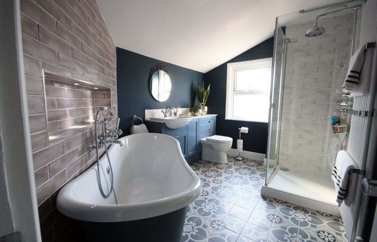 Our talented design Gayle suggested positioning the bath against a new specially built angled wall. The tiled wall hides plumbing, allows for the addition of a handy and stylish niche and makes a fantastic quirky focal point to the room.