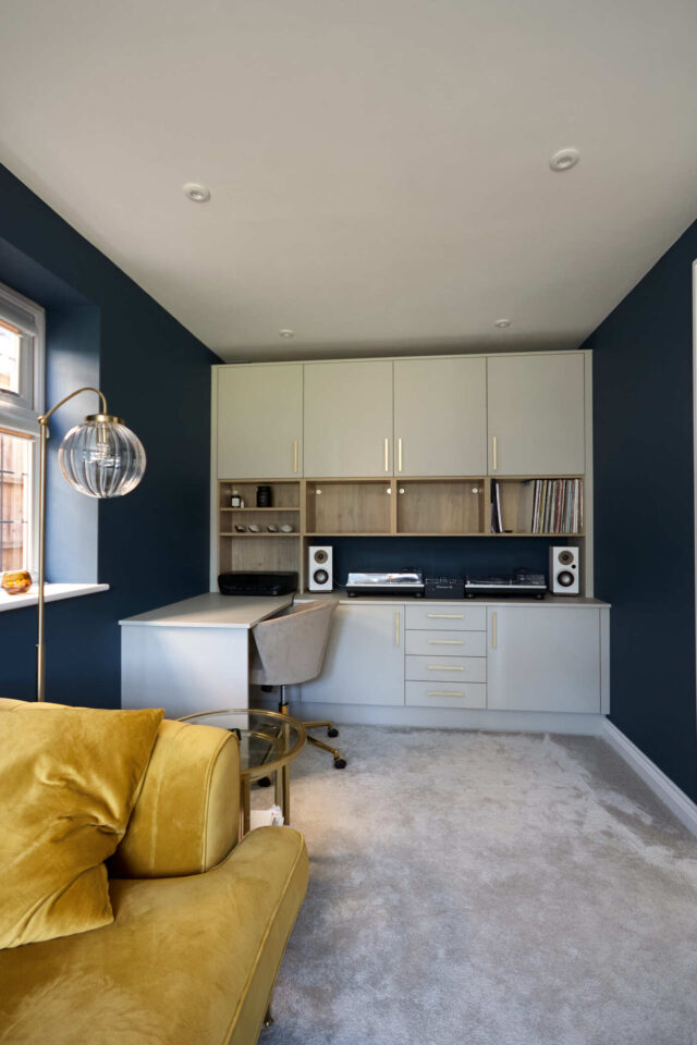 “A dreamy, tranquil snug of dreams… Mrs Hunt’s new office and snug space is the perfect blend of calm and comfort for the whole family. Our design allowed for a cosy sofa to unwind on in the evenings while still leaving plenty of room for a fantastic office setup during the day.” – Lucy, Designer