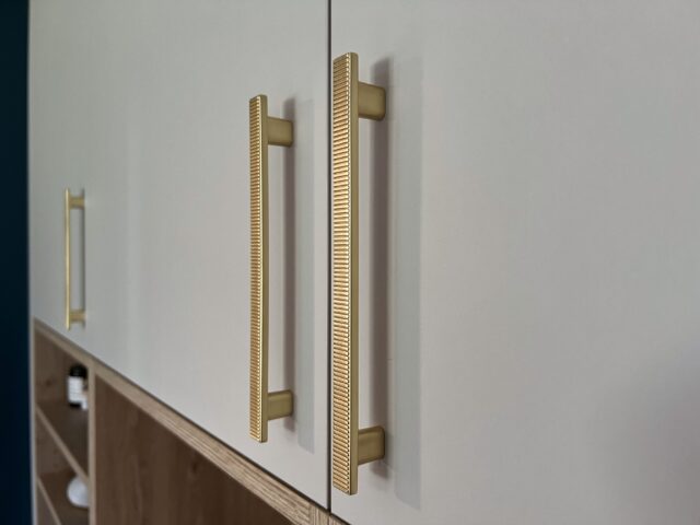 Mrs Hunt sought a versatile area that could serve as a home office and a snug area to unwind when required. To further elevate the room’s luxurious and welcoming feel, the soothing deep teal wall provides a stunning contrast against the soft cream cabinetry, and the taupe grey doors with stunning gold bar handles beautifully complement the rest of the décor. The mustard yellow sofa, set against the tonal navy wall, perfectly accentuates the cupboard doors, highlighting their best features, and the plush cream chair with gold accents harmonises with the circular glass table to add a modern touch.