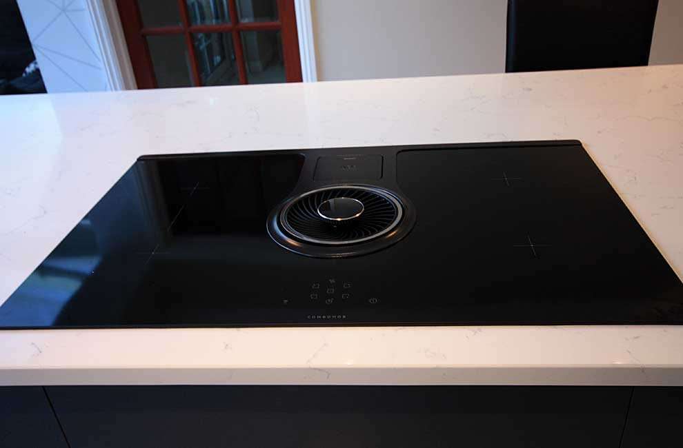 Lara, Ream’s Kitchen Designer created a spacious, yet welcoming kitchen design with a two-tone shaker kitchen in charcoal and light grey. Where previously the hob was in the corner of the kitchen, Lara designed the hob to take centre stage in the kitchen.