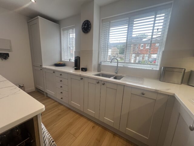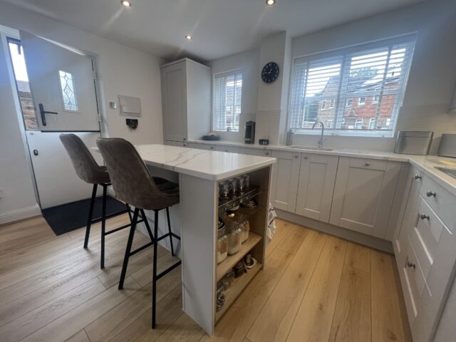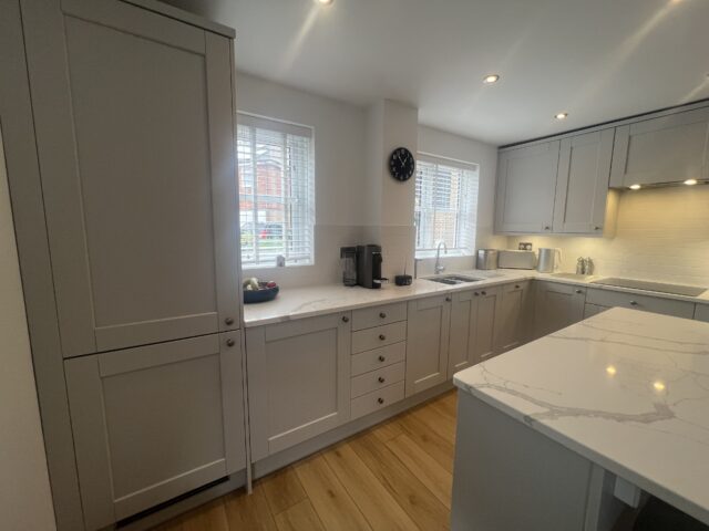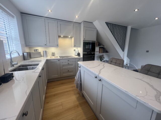 To complement the cabinetry, crisp white quartz worktops with subtle veining were introduced across the perimeter and the island, bringing a sense of elegance and durability to the space. The matching upstands and classic white tiled splashback add to the refined, layered look, helping the kitchen feel bright, open, and effortlessly cohesive.