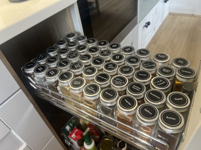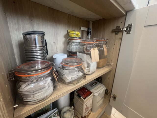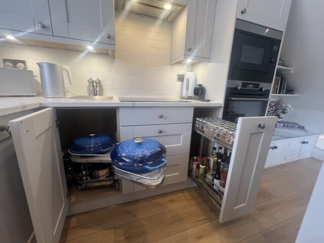 Integrated appliances were incorporated throughout to maintain a streamlined finish, including a neatly positioned oven stack and a discreet AEG extractor above the hob. Clever internal storage solutions, such as pull-out larders and corner mechanisms, further enhance the practicality of the space, keeping everything organised and within easy reach.