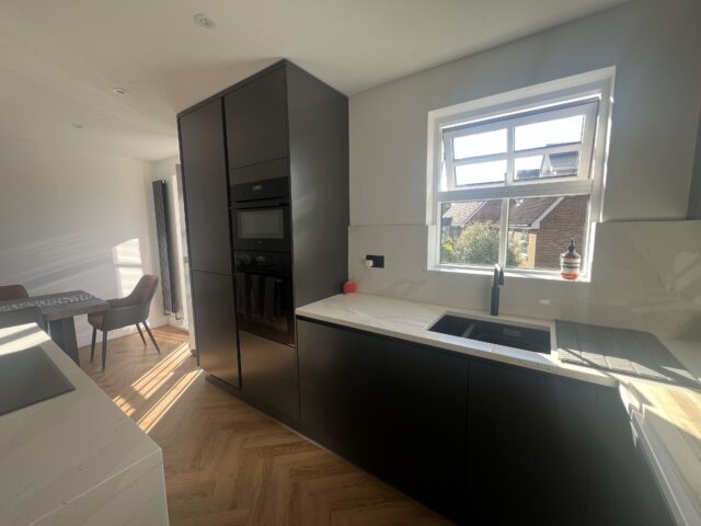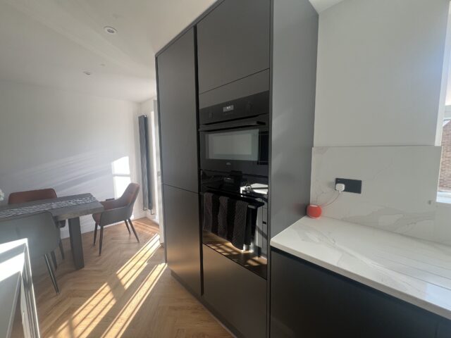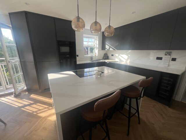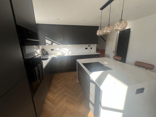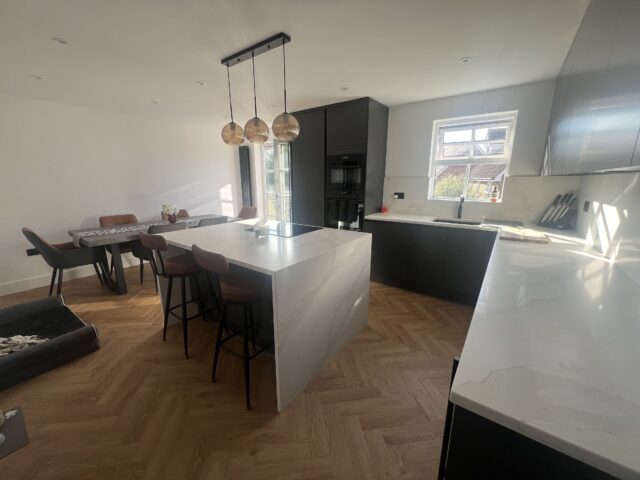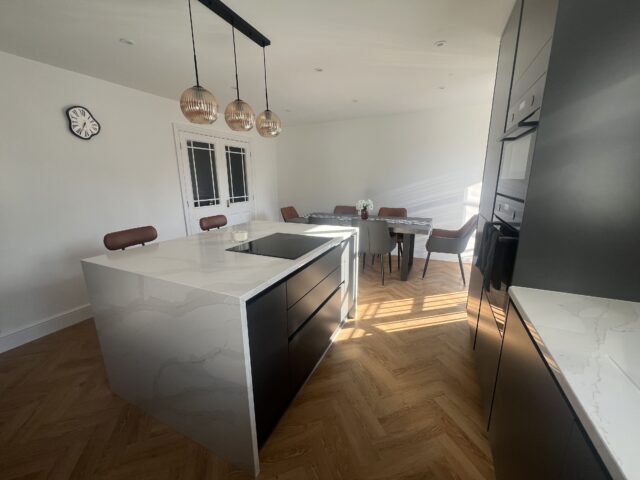 For this project, the client wanted a kitchen with a bold, contemporary feel, something sleek and minimal, yet still warm and inviting within a bright, open-plan setting. With natural light pouring into the space and the kitchen flowing directly into the dining area, the design needed to feel seamless and well-balanced, using darker tones to complement the airy room rather than overpower it. A statement island, integrated appliances, and clean modern lines were key to creating a space for everyday living and entertaining.