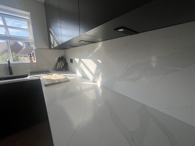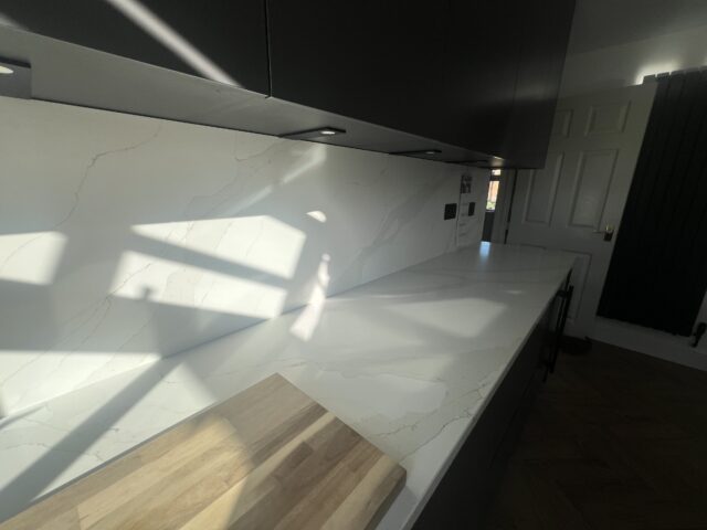 This striking modern kitchen makes an immediate impact with its deep, handleless cabinetry and clean architectural layout. The dark finish creates a sophisticated backdrop, while the streamlined design keeps the space feeling calm, uncluttered, and effortlessly contemporary. To soften the palette and introduce a sense of lightness, the cabinetry is paired with crisp, marble-effect surfaces featuring subtle veining. Used across the perimeter and continued up the walls as a full-height splashback, these bright finishes bring balance and elegance, reflecting natural light and enhancing the kitchen’s open, airy feel.